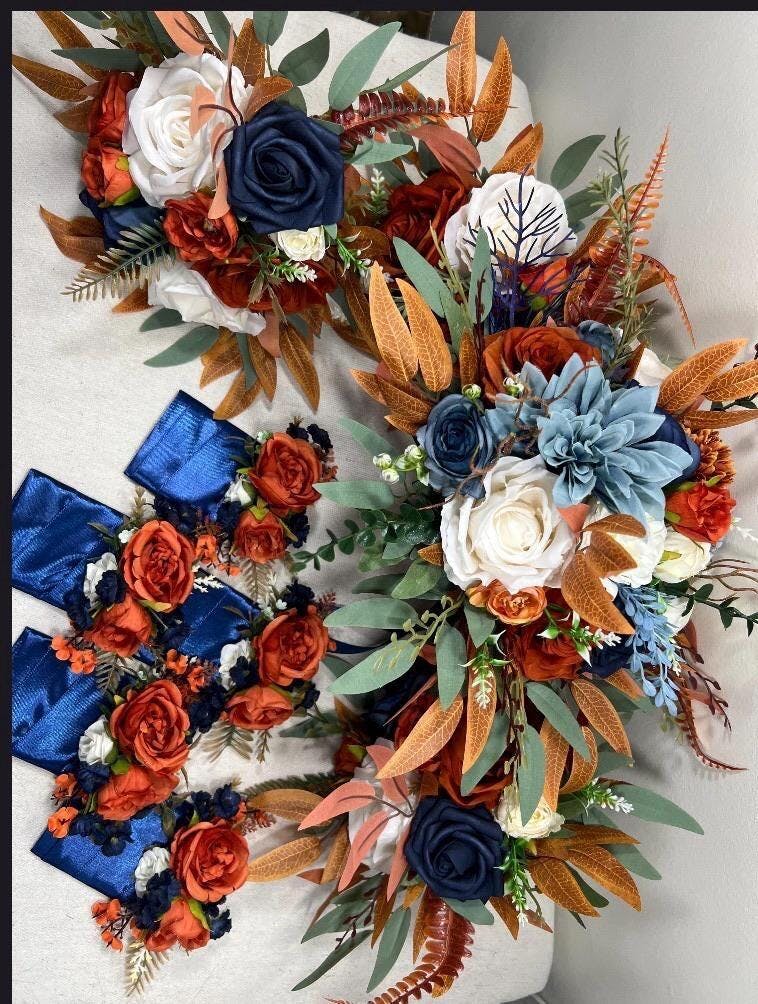 Navy Blue Orange Bouquet Cascade White Rust Blue Bouquet Bridal Cascading Terracotta Navy Blue Ivory Bouquet Bridesmaids Burnt Orange