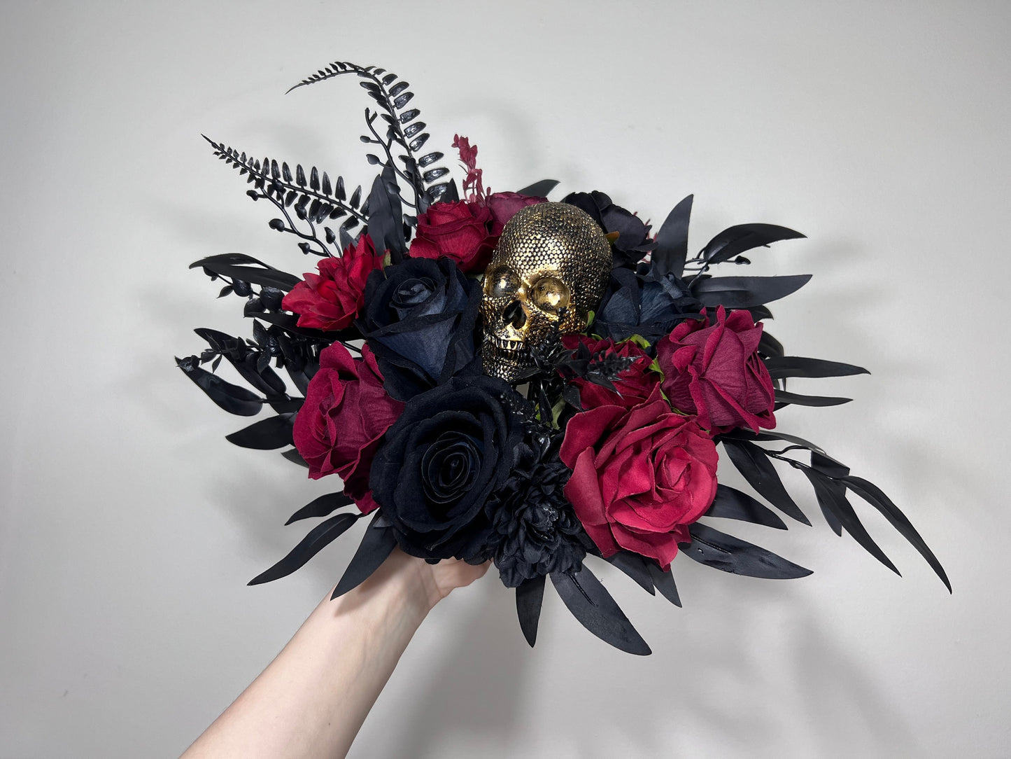 Wedding Bouquet Black Burgundy Gold Skull Bridal Wedding Gothic Halloween Bouquet Bridesmaids Black Skull Spooky Burgundy Fun Bouquet Metal