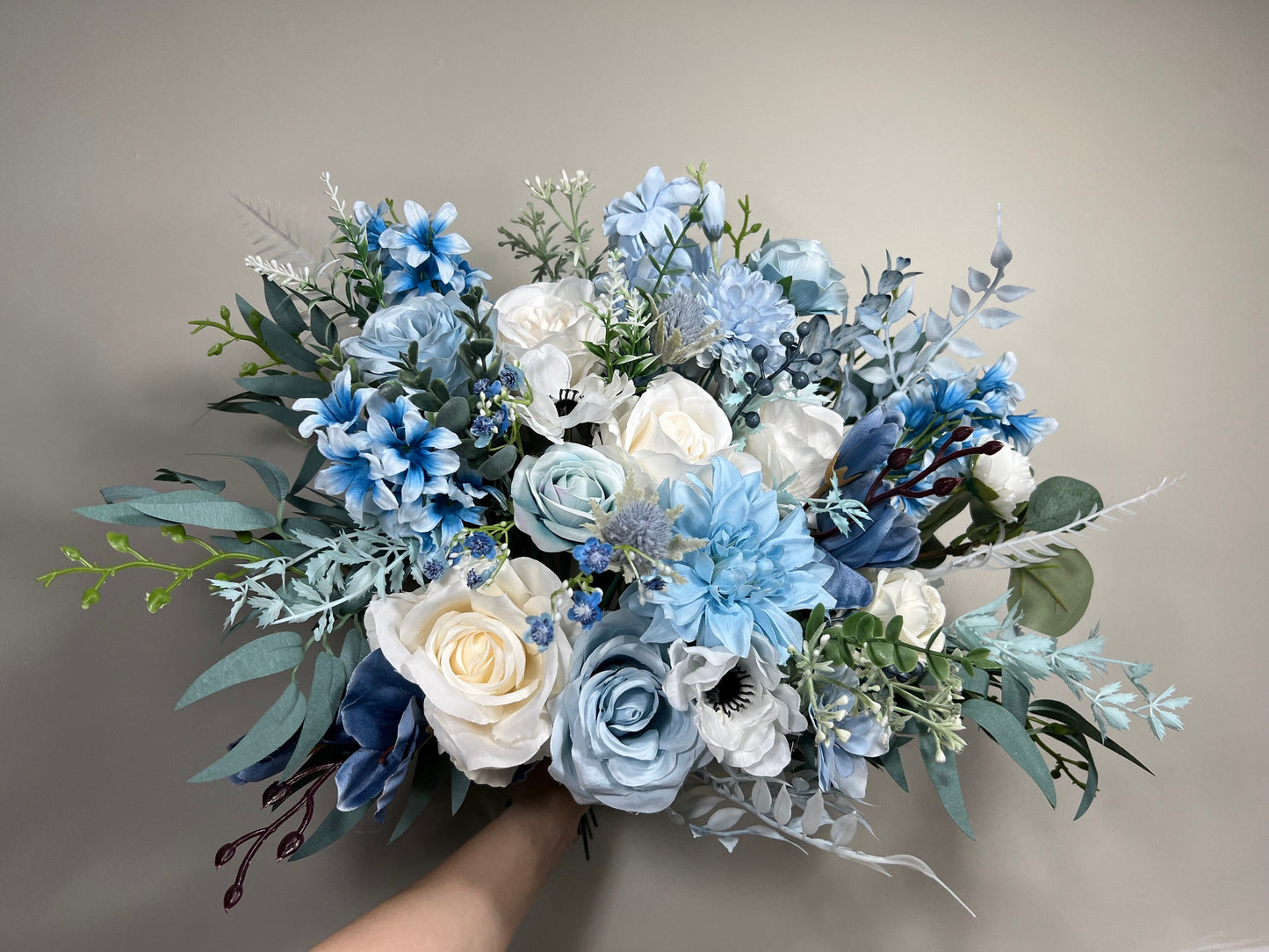 Wedding Bouquet Dusty Blue Bridal Rustic Blue Wedding White Bouquet Anemone Wild Flower Light Blue Winter Eucalyptus Ivory Artificial Flower
