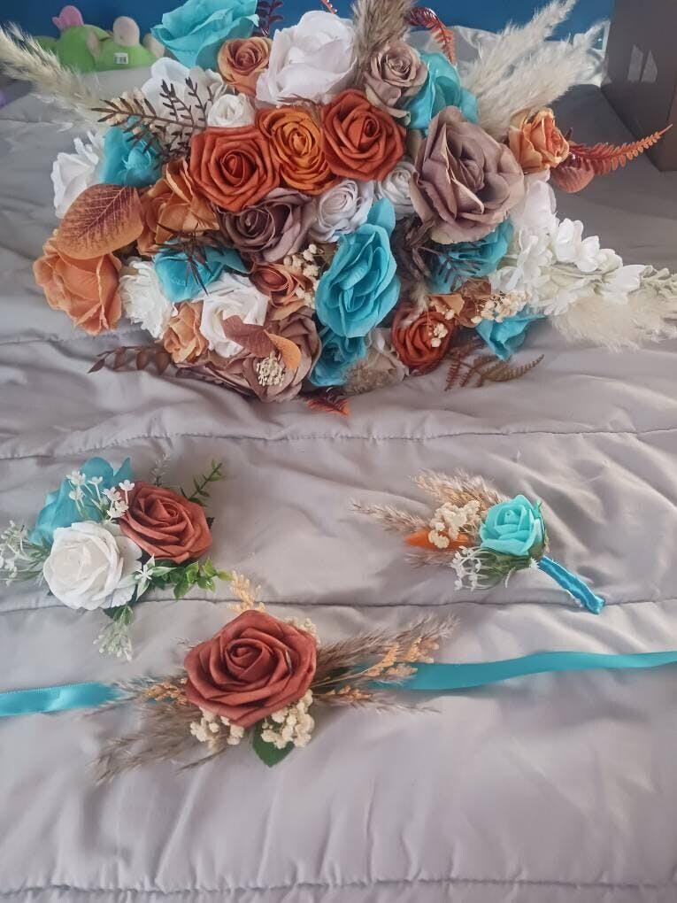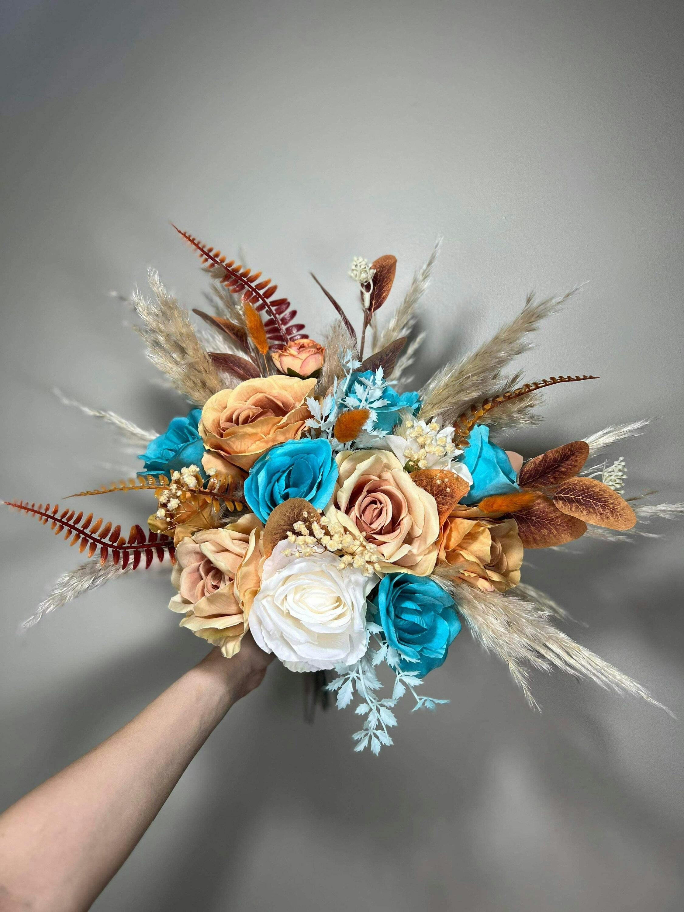 Wedding Bouquet Terracotta Turquoise Cascade Boho Bridal Rust Wedding Cascading Burnt Orange Cinnamon Decor Artificial Flower Fall
